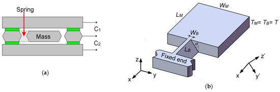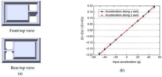 Figure 1a. Its MEMS sensing part is composed of three different silicon layers, and the middle layer consists of a proof mass and a support spring that serve as the inertial sensing elements. When acceleration is applied, the proof mass will move upward or downward and cause a capacitance change (Δ