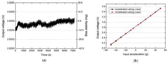 Figure 7a shows that this accelerometer has demonstrated a short-time bias stability of 3.84 mg (1σ) or 15.7 mg (maximum drift). The white noise of this accelerometer was also measured to be 40.2 μV/√Hz. Then, the accelerometer’s dynamic response was also measured by using a precise centrifuge in the range of ±50 g. The plots in