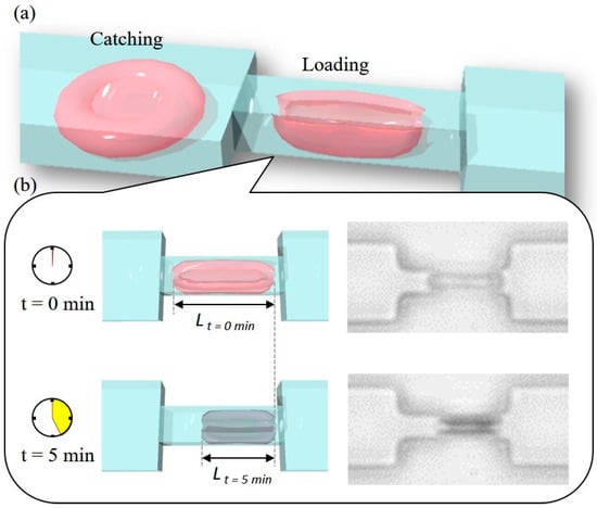 RBC deformability has been found to be correlated with certain diseases [5,15,16,17,18]. For example, RBCs with reduced deformability are found in obese patients and in those with diabetic foot diseases [15,16]. Malaria is a well-known blood-related disease that reduces RBC deformability [17,18]. Unusual morphology of RBCs has been found from those of the compound heterozygous for hemoglobin S and hemoglobin C [19]. There are different approaches for investigating RBC deformability [20,21]. For example, Tözeren et al. used micropipette for developing a constitutive equation for the RBC membrane [22]. Brandao et al. employed optical tweezers for measuring RBC elasticity [23]. Dulinska et al. applied an atomic force microscope (AFM) for measuring the stiffness of erythrocytes [24]. Among different evaluation methods, microfluidic constrictions have become popular in the last decade because of their precise fabrication and accurate control [25,26,27]. For example, Zheng et al. put RBCs through a constriction for high-throughput biophysical measurements [28]. Sakuma et al. evaluated the cell fatigue state by inducing continuous and repetitive deformation [29]. There are also works investigating RBC responses after long-standing loads. For example, Fischer discovered the shape memory of RBCs based on their recovery from the deformation by shear stress up to 4 h [12]. Markle et al. investigated the viscoelastic properties of the RBC membrane by characterizing their shape after constant-pressure aspiration up to 90 min [13]. Through the microfluidic platform, it becomes possible to stably monitor cells’ behaviors and responses during a fixed-displacement load.