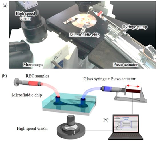 The experimental setup. (a) A photo of the setup; (b) a schematic view of the experimental system. The RBC is manipulated by a vision-feedback control system with real-time RBC position and microfluidic flow control.