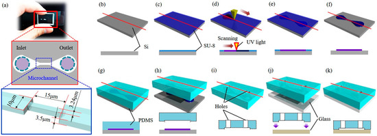 Design and fabrication of the microfluidic chip. (a) Schematic view of the microfluidic chip. The device consists of an inlet, an outlet, a microchannel (3.5 µm in height and 10.0 µm in width), and narrow channel (3.5 µm in height, 15.0 µm in length and 3.24 µm in width); (b–f) the step-by-step photolithography for mold fabrication; (g–k) the step-by-step procedure for poly-dimethylsiloxane (PDMS) chip fabrication from the mold.