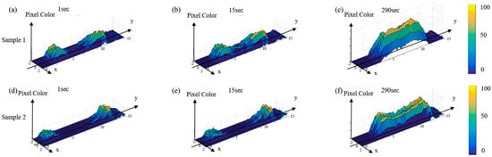 Figure 5a–c and Figure 5d–f show the color distribution of two different RBCs during the same long-standing load. The x, y and z axes in the figure represent the x, y positions, and the corresponding color value, respectively. The color is in standard 8-bit grayscale, where the color of each pixel ranges from 0 (white) to 255 (black). The durations of loading shown in Figure 5a,d, Figure 5b,e and Figure 5c,f are 1, 15 and 290, respectively. One consistent tendency for the two different RBCs, as well as all the tested RBCs, was that the overall pixel color of the cells got darker with respect to the loading time. However, the color patterns were different. The pattern around the center of the RBC in Figure 5c is flat whereas the one in Figure 5f is like a valley where the color of the central pixels is lighter than the surrounding pixels. The shrinkages of the RBC lengths during the load can also be observed in Figure 5. The length changes of RBC Sample 1 and 2 can be seen in Figure 5a–c and Figure 5d–f, respectively. The shrinkages of the RBCs on the top and bottom of Figure 5 were about 5% and 14% with respect to their initial lengths at t = 0 s. According to the two samples shown in Figure 5, we find that while different RBCs share a similar tendency of getting darker and shorter, they also have different responses in terms of the color patterns and the amount of shrinkage during the long-standing load.
