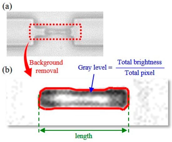 Figure 6 explains the image processing method for the representative cell color and length. Figure 6a shows a captured image from the camera. A background image was subtracted from each captured image for background removal. Figure 6b shows the cell image after background removal. Although the color on a RBC is not uniform and may have different patterns, such as the two examples shown in Figure 5, for the convenience of analysis, the gray level was defined as a representative color value for a RBC and was the average of the color values over the RBC. The RBC length is the distance between the left-most and right-most points of the detected cell area image as the green arrow indicates in Figure 6.