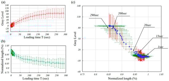 The experimental results of the gray level and cell length of the RBCs with respect to the loading time. (a) The change of the gray level with respect to the loading time; (b) the change of the cell length with respect to the loading time; (c) the change of the gray level with respect to the cell length at different instances.