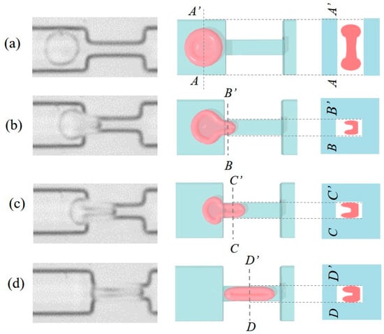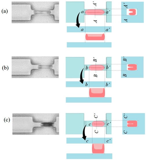 Figure 8a–d show a RBC entering a constriction. The left column of Figure 8 shows a series of actual photos indicating the cell behavior during the entrance phase. A video clip of a RBC entering and exiting the constriction can be found in Supplementary Materials Video S3. A RBC is usually assumed being able to deform freely as long as the total surface area remains constant [37]. Based on the assumption, the possible shape changes of the RBC during the entrance phase are illustrated in the middle and right columns of Figure 8, which are the top view and the cross-sectional view, respectively. According to the photos, the RBC seems not only to be compressed but also folded in half for entering into the constriction. The cross-sectional area of the channel is gradually filled with the deformed RBC during the entrance. However, there are still vacancies around the deformed RBCs after the full entrance of the RBC.