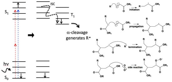 On the left is shown a Jablonski diagram where an electron in the photoinitiator can become excited from the ground state, S0, to an excited state, S1, either by absorbing ultraviolet (UV) light or two photons of near-infrared (NIR) light. The excited electron relaxes and flips its spin by internal conversion (IC), and flips its spin by intersystem crossing (ISC), and goes to an excited triplet state, T1. From T1 the molecule can undergo α-cleavage to generate radicals, which then begins the polymerization reaction shown on the right. Notably, the last side reaction listed is possible if the resin contains dissolved O2. This reaction with O2 yields a less labile peroxy radical and effectively quenches the polymerization reaction [19].