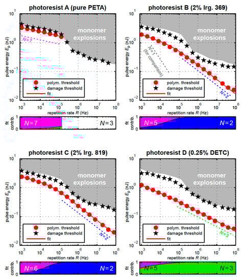 Another method to measure the order of nonlinear absorption, but in the resin, was recently developed by Wegener and coworkers [22]. They used a Ti:Sapphire oscillator delivering 150 fs pulses centered around 800 nm in conjunction with a pulse picker and an acousto-optic modulator to control the repetition rate and pulse energy, respectively. With this setup they were able to vary the repetition rate over a wide range from 1 kHz to 80 MHz. At a particular repetition rate, they adjusted the pulse energy and measured the polymerization threshold above which the polymer would remain after washing, as well as the damage threshold, where uncontrolled polymerization took place. They graphed these thresholds as a function of repetition rate and fit the data to multi-exponential curves, for example: Dacc = a2Ep2 + a5Ep5. Where Dacc is the dosage energy accumulated per pulse, a2 and a5 are fitting or weight constants and Ep is the energy of the pulse. The order to which the Ep is raised corresponds to the nonlinear absorption order, n. The authors used the S0–S1 energy gap of the photoinitiators as well as the ionization energy of the photoinitiators to inform their data fitting. They found that their monomer, pentaerythritol triacrylate (PETA), could be polymerized without any photoinitiator with a corresponding seventh-order nonlinear absorption, which is approximately equal to the ionization energy of the monomer. Similarly, a resin containing Irgacure 819 as the PI fit the data for a second-order nonlinear absorption, which is nearly identical to the S0–S1 gap for that initiator. It was found that as the repetition rate was lowered the order of the nonlinear absorption increased; in most cases from two- or three-photon absorption of the initiator to five-, six-, or seven-photon absorption corresponding to the ionization of the initiator and/or monomer. The magnitude of the weighting factors indicates the transition from low to high order process as the repetition rate decreases, which is shown below each graph in Figure 2.
