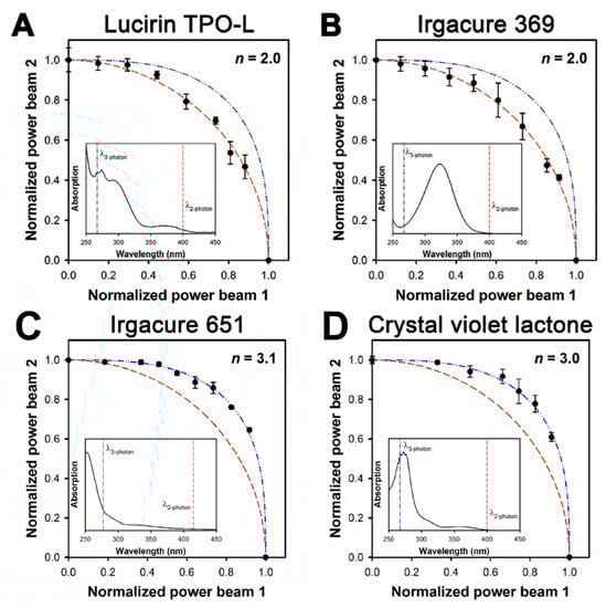 Thus, by plotting the P2* necessary to reach the polymerization threshold for different values of P1* and fitting the data with Equation (3), the values of n can be measured as shown in Figure 3. The researchers performed the 2-BIT measurement for four different photoinitiators in an acrylic resin; TPO-L, Irgacure 861, Irgacure 651, and crystal violet lactone. The latter two photoinitiators were determined to start photopolymerization by three-photon absorption while the first two photoinitiators were determined to start photopolymerization by two-photon absorption.