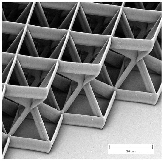 High resolution SEM is without any doubt the best way to measure feature sizes in TPP. It is a fast, non-destructive imaging technique which requires little or no sample preparations and it delivers images with more than adequate spatial resolution for precise and repeatable measurements. Furthermore, imaging by SEM is also tremendously effective at capturing the topology of complex three-dimensional microstructures fabricated by TPP. By rotating and tilting the sample, imaging by SEM enables direct views of three-dimensional architectures that would be otherwise impossible to perform with other imaging techniques. An example of this ability is displayed in Figure 5, where the SEM image of a microstructure fabricated by TPP is shown. The composition of the structure unit cell with the four diagonal beams is clearly exposed in this image.