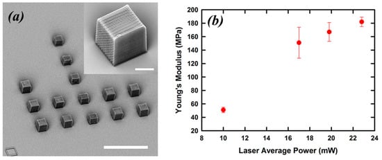 SEM of the TPP microstructures used in the mechanical testing (a); scale bare is 40 µm. A close-up image of one of the tested cubes (b); scale bar is 5 µm. Dependence of microstructures’ Young’s modulus on laser average power used to make them (b). Reproduced from [29].