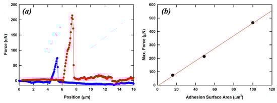 By employing a lateral probe in the same testing machine, the authors of the previous work were also able to measure the adhesion properties of TPP microstructures. The sample consisted again of a series of polymerized cubes with sides of 10, 7, and 4 µm. The writing speed and the laser average power were not changed during the fabrication. Since all cubes were made using the same writing scheme and the same experimental conditions, the expectation was that the adhesion properties of these objects must reside in the surface area which is in contact with the glass substrate. The force displacement curves for two cubes are shown in Figure 8a. No significant force is measured before contact between the sample and the probe. As soon as contact is engaged, the applied force increases with minimum displacement of the microstructure. When the applied force exceeds the adhesion between the cube and the glass, the probe will measure again displacement with no force. This is because the cube is no longer attached to the glass substrate. The maximum force needed to dislodge the cube from the glass substrate were measured and plotted as a function of the surface contact area in Figure 8b. A clear linear dependence is observed with a slope of 4.7 µN/µm2.
