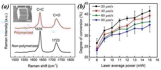 To evaluate the usefulness of Raman spectroscopy in TPP, a series of micro-cubes were fabricated first and then characterized using a confocal Raman micro-spectrometer. An SEM image of a microstructure used in the study is shown in the inset of Figure 9a. The micro-cubes were fabricated using several laser average powers and writing speeds. For each microstructure, Raman spectra like the ones in Figure 9a were recorded and then used to measure DCs using Equation (4). The results are shown in Figure 9b. At constant writing speeds, DC values monotonically increases with increasing laser average power. The highest DC value is around 43%; larger DCs were not attainable because the resin started to boil if higher laser average powers were used.