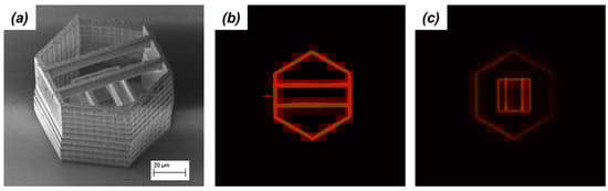 The microstructure consists of two towers, one inside the other; a large one with a hexagonal base and a smaller one with a square base. At the top of each microstructure, two freestanding beams connect adjacent sides. Since the outside tower is 40 µm tall while the inside tower is 20 µm tall, there is no overlap among the two sets of beams. As the image in Figure 10a shows, it is difficult to clearly expose all the parts of the microstructure by SEM. When imaging the same microstructures by TPEF microscopy instead, cross-sections can be retrieved with high spatial resolution. The fluorescent image recorded at a height of 30 µm from the substrate (Figure 10b) shows the framework of the hexagonal tower and the horizontal beams. The fluorescent image recorded at a height of 8 µm from the substrate (Figure 10c) shows strong signal from the square tower and the vertical beams. A faint signal from the hexagonal tower is observed also in this figure. No signal crossover is observed in the two fluorescent images.