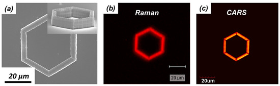 To demonstrate the difference between Raman and CARS signals, a simple test was performed. First, a microstructure was fabricated by TPP using an acrylic based resin (Figure 11a). Then, the microstructure was imaged using confocal Raman and CARS microscopy. The signal generated at 3000 cm−1 was used to build the images of the polymeric microstructure in both cases. The results of the comparison are shown in Figure 11b,c. The confocal Raman microscopy image was acquired using a microscope objective with a numerical aperture of 0.75, an excitation wavelength centered at 514.5 nm, and 35 mW of laser power. Only signal between 2800 and 3000 cm−1 was used. The CARS microscopy image was acquired using a microscope objective with a numerical aperture of 1.1, pump and Stokes wavelengths centered at 800 and 1050 nm, respectively. The laser average powers for the two beams were 4 mW (pump) and 10 mW (Stokes).
