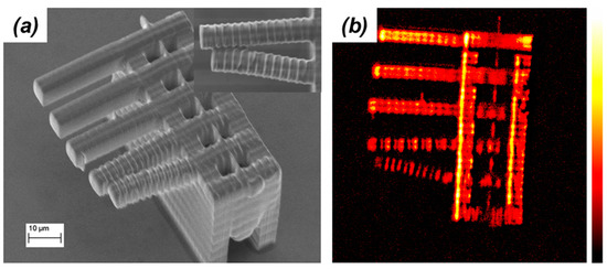 TPP microstructure imaged by (a) SEM and (b) CARS microscopy. The inset in (a) shows a top and magnified view of the bottom two cantilevers. The false color CARS image is made of pure resonant signal at around 3000 cm−1. Reproduced from [56].