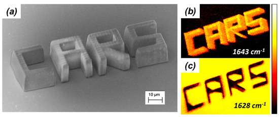 Although performing CARS microscopy in the 3000 cm−1 region provides useful information on the structural integrity of three-dimensional microstructures fabricated by TPP, it would be desirable to obtain CARS images with contrast based on the chemical differences between the polymerized and unpolymerized parts of the sample (in situ characterization). This is possible by performing CARS microscopy in the fingerprint region of the TPP resins’ Raman spectra, and taking advantage of the fact that CARS signals possess highly dispersive spectral line shapes. A demonstration of this unique feature of CARS microscopy is represented in Figure 10. The word CARS was written by TPP onto a glass substrate. Each letter was 20 μm wide, 25 μm long, and 10 μm tall. An SEM image of this microstructure is shown in Figure 13a. While still immersed in the bath of unpolymerized resin, the same microstructure was imaged by CARS microscopy. Images with completely reversed contrast were obtained when the Raman shift was tuned from 1643 to 1628 cm−1. At 1643 cm−1, shown in Figure 13b, the signal from the microstructure is stronger than the signal from the unpolymerized photoresist, while at 1628 cm−1, shown in Figure 13c, the signal from the unpolymerized photoresist is stronger than the signal from the microstructure. Imaging with chemical contrast as shown in Figure 13, can then be employed to visually distinguish among polymerized and unpolymerized parts of microstructures fabricated by TPP.