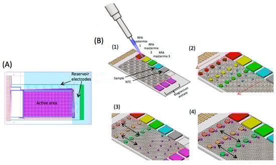 (A) Schematic representation of the TFT substrate of the AM-EWOD digital microfluidic platform. The active area is approximately 20 mm × 37 mm. It consists of 96 × 175 individually addressable circuit elements (or electrodes) within the active area. At the periphery of the device, there are 9 fluid input structures with large reservoir electrodes. Each input structure has a volume of 2.2 μL. (B) (1) Reagents required for the RPA assay are manually loaded onto the reservoir electrodes. These are RPA mastermix (specific to the gene of interest), sample, no template control (NTC), and magnesium acetate (to initiate the reaction). RPA mastermix 1, 2, and 3 contains primers and fluorescence probes for KPC, NDM-1 and CTX-M-15 genes respectively. (2) Daughter droplets are dispensed from the reservoirs. Sample and NTC droplets have a volume of 45 nL while RPA mastermix has a 180 nL volume. Red arrow represents the direction of dispense of the daughter droplets (see Video S1 in Supplementary Materials). (3) RPA mastermix droplets are mixed with sample or NTC droplets (volumetric ratio 4:1). Magnesium acetate droplets are also dispensed from the three reservoirs along the short edge of the TFT substrate. Black arrow represents the direction of droplet movement to facilitate mixing of RPA mastermix droplets with sample/NTC. (4) Magnesium acetate droplets are merged with the droplets containing DNA/NTC and RPA mastermix to initiate the reaction. The resulting droplets are moved on the active matrix (main array) of the TFT substrate (in the direction of black arrows) to thoroughly mix the contents of the reaction droplet. Following this step, the devices were heated to 39 °C and fluorescence recorded in real time. Illustration not to scale. For a video of the device in operation see Video S1.