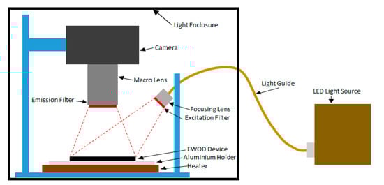 A custom wide-field fluorescence detection system was made to image the entire device as shown in Figure 2. Light from an LED is directed on the chip by a focussing lens (100 mm, f2.8) and a band pass filter (590–650 nm, Semrock, Cambridgeshire, UK) to obtain the required wavelength for fluorophore excitation. The fluorescence emitted by the droplets was imaged by DSLR camera (Canon 5D, Mark III), fitted with a macro lens (55 mm focal length) and an emission filter (670–740 nm, Semrock). The droplets were exposed for 3 s and fluorescence recorded for a 2.5 s window during the exposure. An image was obtained every 30 s over 30 min using a custom software that controls the camera and light source.