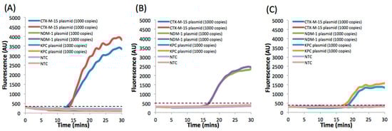 The specificity of the primers and probes for a given gene was also evaluated by amplifying samples without the specific genes present. Figure 3A shows amplification curves (in duplicates) for a sample containing three different genes (CTX-M-15, NDM-1, and KPC) in a reaction mixture containing primers and probes for only the CTX-M-15 gene. No amplification was observed for NDM-1 and KPC, while the fluorescence intensity from the sample containing plasmid with CTX-M-15 increased exponentially after a lag phase. Similarly, Figure 3B,C demonstrates the high specificity of the assay to the genes encoding for NDM-1 and KPC. The time to positivity (TTP) for a sample containing 1000 plasmid copies of CTX-M-15, NDM-1, and KPC was 13 ± 0.5, 16.7 ± 0.1, and 17.6 ± 0.8 min, respectively.