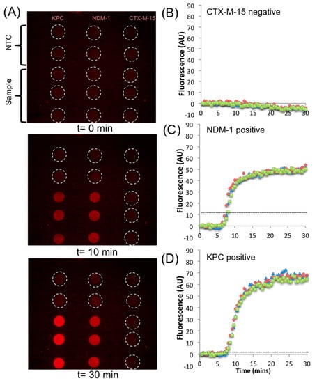 As shown by the end-point fluorescence image, no DNA contamination occurred during droplet manipulation, as evidenced by the consistent lack of amplification in the no template control (NTC) reactions. The example reaction shown in Figure 4A used droplets with plasmids and genes encoding for NDM-1 and KPC; thus, the reaction showed positive for those genes and negative for CTX-M-15. Figure 4B–D shows the amplification curves for the droplet reactions in Figure 4A obtained from the fluorescent images. The TTP for NDM-1 and KPC for 1000 copies is 7.3 ± 0.3 and 7.4 ± 0.3 min, respectively, which is twice as fast as the bench top assay consistent with previous observations [28].