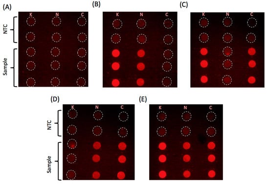 End point fluorescence images for reaction droplets at t = 30 min. Sample are as follows: (A) no plasmid; (B) plasmids with KPC and NDM-1; (C) plasmids with KPC and CTX-M-15; (D) plasmids with NDM-1 and CTX-M-15; (E) plasmids with CTX-M-15, KPC and NDM-1 (1000 copies each). Reaction was run in triplicate on the devices. The headers K, N, and C identify column with droplets that contain primers and probes for KPC, NDM-1, and CTX-M-15, respectively. See Figures S4 and S5 for DNA amplification curves corresponding to the images shown in B, C and D, E.