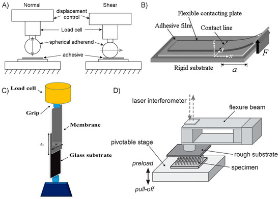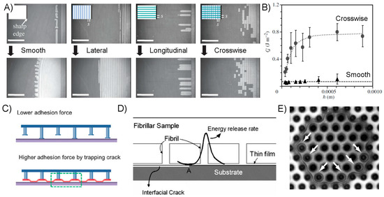 - Castellanos, G.; Arzt, E.; Kamperman, M. Effect of viscoelasticity on adhesion of bioinspired micropatterned epoxy surfaces. Langmuir 2011, 27, 7752–7759. [Google Scholar] [CrossRef] [PubMed]