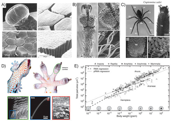 - Federle, W. Why are so many adhesive pads hairy? J. Exp. Biol. 2006, 209, 2611–2621. [Google Scholar] [CrossRef] [PubMed]
