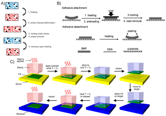 - A cooling and unloading phase, wherein the SMP is cooled below its Tg to reduce compliance and fix its shape, at which point it has maximized its adhesive bond strength,