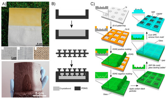 - Yang, S.Y.; Carlson, A.; Cheng, H.; Yu, Q.; Ahmed, N.; Wu, J.; Kim, S.; Sitti, M.; Ferreira, P.M.; Huang, Y.; et al. Elastomer Surfaces with Directionally Dependent Adhesion Strength and Their Use in Transfer Printing with Continuous Roll-to-Roll Applications. Adv. Mater. 2012, 24, 2117–2122. [Google Scholar] [CrossRef] [PubMed]
