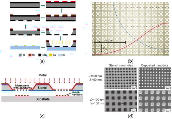 Compared with other emerging nanolithography techniques, stencil lithography is a resistless, scalable, and reusable nanolithography technique that has high throughput. The use of stencils is among one of the oldest technologies in human history, for which evidence is found from over 35,000 years ago []. The concept of using stencils is to transfer the features from a thin sheet, such as paper, wood, or polymer, to the underlying substrates. Because the stencil can be reused on different objects, the defined patterns on the substrates will have the same feature size. This concept has been used to develop stencil lithography for micro- and nanopatterning. Stencils made by lithography and etching allow for the transfer of atoms or ions from the aperture to the target substrates, either by physical vapor deposition or plasma etching.