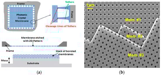 (a) Schematic of the membrane stacking approach using the cleavage of tethers from the frame. Reprinted with permission from []. Copyright [2011], American Vacuum Society; (b) SEM image of a stack of three silicon membranes. Reprinted with permission from []. Copyright [2011], American Vacuum Society.