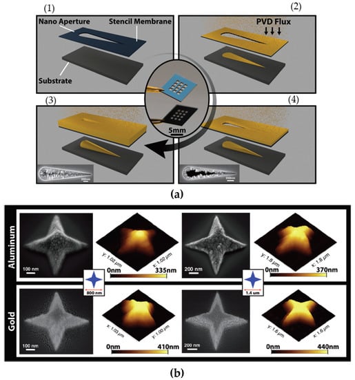 Even though clogging could be a problem for stencil lithography, it could also bring unique opportunities for nanofabrication. For example, as the aperture size of the stencil mask decreases because of clogging, it is possible to fabricate nanostructures with smaller features than the original lithography design. In addition, during the deposition, the feature size becomes smaller. This results in the thicker deposition in the lower part of the nanostructures and thinner deposition in the upper part. This closing effect can be used to make high aspect ratio 3D nanostructures with variable dimensions along the deposition direction. An example of such 3D nanostructures fabricated by using the closing effect is shown in Figure 4b []. A four-pointed star-shape is presented in two different dimensions (with total widths 0.8 μm and 1.4 μm, respectively) and materials (aluminum and gold, respectively). The 3D nanostructures profile can be controlled by tuning the parameters in physical vapor deposition.