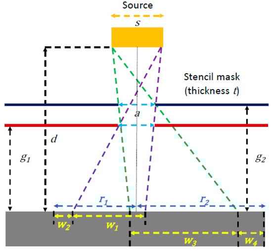 where w1 represents the enlargement caused by shadow effect, w2 represents the halo effect, s represents the width of the source, d represents the distance between source and substrate, a represents the feature size of the aperture, and g1 represents the distance between the stencil and the substrate. The thickness of the stencil, t, is assumed to be small compared with the gap size and is neglected.