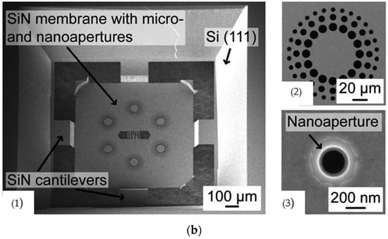 (a) Feature size of dƮ with a gap distance of g (left). Feature size of dƮ with a gap distance of g by using a compliant stencil mask. Reproduced from [] with permission of The Royal Society of Chemistry. (b) SEM image of a free-standing compliant membrane suspended by four cantilevers (1) and the images of nanoapertures on the SiNx membrane (2,3). Reproduced from [] with permission of The Royal Society of Chemistry.