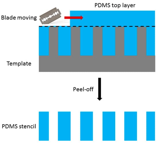 However, creating an aperture in PDMS is very challenging. Since PDMS is poured onto the microstructures, the top layer needs to be removed using a doctor blade []. A scheme of the creation of a PDMS stencil is presented in Figure 8. After the curing of PDMS, a sharp blade has to be used to remove the top layer of PDMS to open the aperture. This could lead to damage to the mold and it is difficult to locate the cross section for the removal. After removal of the top layer, the stencil can be peeled off from the template. As removing the top layer is typically done manually, removing the top surface of nanostructures is extremely difficult. Other techniques such as applying negative or positive pressure on the PDMS film for stencil mask fabrication have been introduced to remove the top layer, but all increase the complexity [,]. Since PDMS is inert and it is difficult to etch an aperture through a PDMS membrane, PDMS stencils are not an ideal candidate for nanoscale stencil lithography.