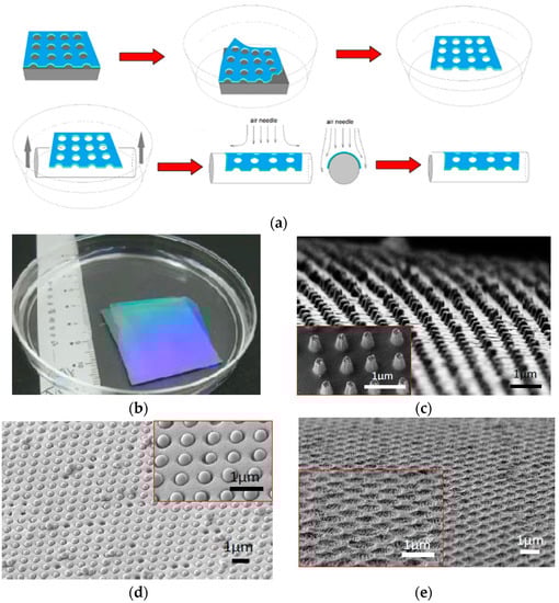In recent decades, progress in micro-electro-mechanical systems (MEMS) and nano-electro-mechanical systems (NEMS) has significantly impacted the research and development of wireless communication [,], inertial sensing [,], optics [,], biomedical engineering [,], and new energy [,]. Because the performance of the MEMS and NEMS devices relies heavily on fabrication techniques, there is a strong demand to develop scalable and inexpensive fabrication techniques. The traditional micro- and nanofabrication techniques typically start with spinning photoresist on a flat and rigid substrate, followed by defining structures with photolithography or electron beam lithography (EBL). After patterning photoresist, thin film deposition and etching are used to transfer the pattern and fabricate the device. Traditional micro- and nanofabrication techniques are designed to pattern on rigid substrates, such as silicon wafers. Patterning micro- and nanostructures on unconventional substrates, such as soft and flexible materials (e.g., polydimethylsiloxane (PDMS)) and curved substrates [,], emerged in recent years because of applications in wearable electronics [], implantable medical devices [], and disposable sensors []. Also, as the required resolution reaches down to a nanometer scale, traditional patterning techniques such as EBL are slow and expensive to pattern in a large area. These problems limit the scalability of the nanodevices.