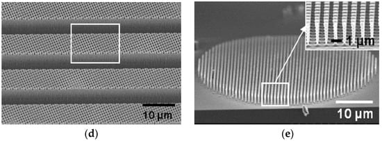 For example, a nanoporous tri-layer membrane made via laser interference lithography was placed on pre-patterned silicon microstructures (Figure 10b). To create high aspect ratio nanopillars on top of the silicon microstructures, a thin layer of Cr was deposited through the nanopores of the flexible tri-layer membrane. After the release of the membrane, silicon microstructures were etched by using DRIE to form high aspect ratio nanostructures on the top surfaces. In order to create high aspect ratio nanoholes on the silicon microstructures, DRIE was directly applied through the nanopores of the tri-layer stencil mask. The SEM images of the high aspect ratio nanopillars featured on microtrenches and nanoholes on microgratings are shown in Figure 10c,d, respectively [].