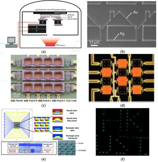 (a) Schematic of a dynamic stencil lithography setup. The stencil mask is mounted on a high-precision XY stage, while the substrate holder is fixed at a controlled distance from the stencil by Z actuators. Reprinted with permission from []. Copyright [2008], American Vacuum Society; (b) parallel fabrication of a multiscale house structure by using dynamic stencil lithography. Reprinted with permission from []. Copyright [2008], American Vacuum Society; (c) a stencil lithography system with integrated deposition sources. Reproduced from [] with permission of The Royal Society of Chemistry; (d) independent actuation of deposition sources for precise patterning of metal atoms. Reproduced from [] with permission of The Royal Society of Chemistry; (e) a digital microfluidic programmable stencil lithography technique for protein and cell patterning. Reproduced from [] with permission of The Royal Society of Chemistry; (f) protein patterning made by using microfluidic programmable stencil lithography. Reproduced from [] with permission of The Royal Society of Chemistry.