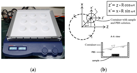 (a) The orbital shaker in this study. (b) The rotating path of the container, with a coated sample and phosphate-buffered saline (PBS) solution, and the relation equation of the fixed global coordinate (X, Y, Z) and the orbitally-moving coordinate (X’, Y, Z’). ω is the rotating speed in rad/s, R is the radius of the rotating path in mm, and t is the time in seconds. The A-A view is the cross section of the container to illustrate the detailed status of the fluid.