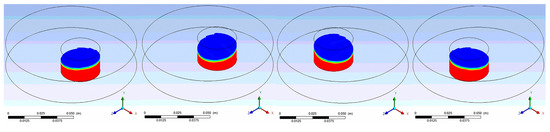The shapes and surfaces (in blue) of the liquid (in red) in the container during a period, where the container is rotated at 120 rpm, i.e., the period is 2 s, along an orbital path with 1 cm diameter. For each position, from left to right, the simulating time is 0.625 s and the time increment is 0.5 s. The coordinate is XYZ system. (Container’s diameter = 3 cm)