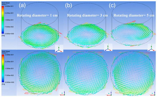 After a very short transient procedure, the flow inside the container was proven, from period to period, to be steady and well-posed at any specific position of the orbital path as indicated in Figure 2. The distributions of the shear stress vector for three rotating diameters on the bottom surface at the simulating time of 2.5 s are visualized in Figure 4 by isometric view and top view. The rotating speed of these cases was kept at 120 rpm. The average and maximum shear stresses along an arbitrary diameter on the bottom surface of the container are shown in Figure 5. The distributions of the shear stress are similar, which suggests that the rotating diameter has little effect on the shear stress of the bottom surface.