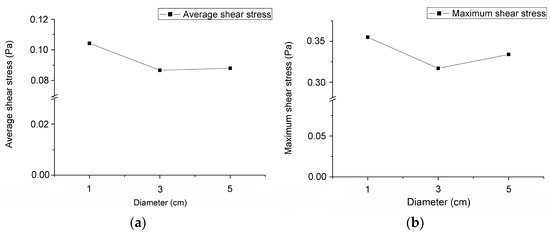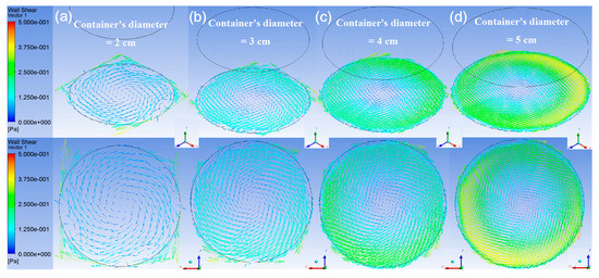 To investigate the influence of the container’s dimensions on the shear stress over the sample’s surface, the distributions of the shear stress vectors for four containers’ diameters on the bottom surface at the simulating time of 2.5 s are illustrated by isometric view and top view in Figure 6. The rotating diameter and rotating speed of these cases were kept at 1 cm and 120 rpm. The average stresses and maximum stresses are shown in Figure 7. In Figure 7a, the average stress increases linearly with the container’s diameter; however, the maximum stress in Figure 7b retains its value until the container’s diameter becomes 5 cm.