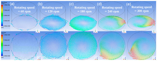 In Figure 8, the distributions of the shear stress vectors for three rotating speeds on the bottom surface at the simulating time of 2.5 s are also illustrated by isometric view and top view. The rotating diameter and container’s diameter of these cases were kept at 1 cm and 3 cm. The average stresses and maximum stresses are shown in Figure 9. It is worth noting that the trend of the stresses is more significant than those in Figure 5 with the rotating diameters and those in Figure 7 with the container’s diameters, especially at the rotating speeds between 180 and 240 rpm. Therefore, the rotating speed of the orbital shaker is suggested to be the major control parameter to set up the shear stress level of the long-term erosion test in this study.