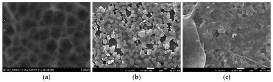 Surface images (×10 k) taken by scanning electron microscopy from (a) bare titanium alloy; (b) titanium alloy sequentially coated with one dopamine interlayer, four heparin/collagen multilayers, and one heparin outmost layer, Ti/Dop/(Hep_Col)4/Hep; and (c) titanium alloy, with one dopamine interlayer, nine heparin/collagen multilayers, and one heparin outmost layer, Ti/Dop/(Hep_Col)9/Hep.