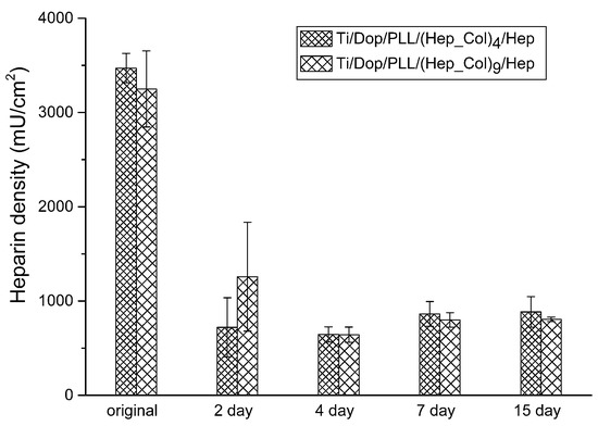 Heparin density of two samples, Ti/Dop/(Hep_Col)4/Hep and Ti/Dop/(Hep_Col)9/Hep, from the beginning to the end of various periods of the tests conducted by the orbital shaker (N = 3).