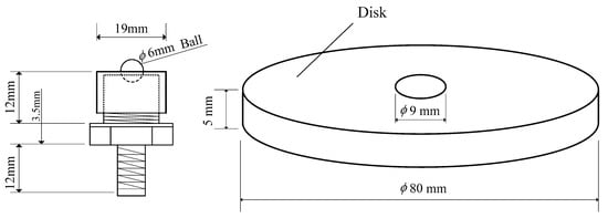 The SUJ2 steel ball is used as the Pin, and the five aluminum alloys are alternately used as the Disk, in the order of 1050, 5052, 5083, 6061 and 7075 aluminum alloys. The contents of the five disks are shown in Table 1. The size and geometry of the test specimens are shown in Figure 2. The sliding distance is set to 100 m, the load is set to 30 N and 60 N, respectively, and the sliding speed is 200 mm/s in this study. The response time of this measurement system is less than 1 ms and the accuracy is 0.1% of the full scale. The experiments were carried out under dry friction conditions. Room temperature was maintained at 25 ± 2 °C, and relative humidity was maintained at 70 ± 5%.