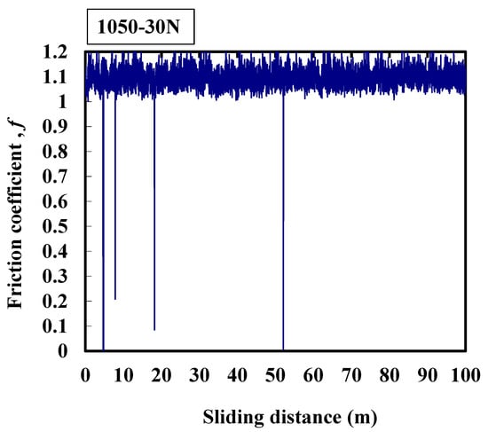 Three reproducibility experiments were conducted. The typical results are shown in Figure 3, Figure 4, Figure 5, Figure 6 and Figure 7. Figure 3 shows that the average friction coefficient of 1050 is 1.1. Generally, the friction coefficient changes in the range of 1.0 to 1.2, the amplitude is large, and the friction frequency is high. Occasionally, during the experimental process, the friction coefficient suddenly decreases to 0, which may indicate the jitter between the interfaces resulting from the wear particles. The oxidation film has broken into small particles between the contact interfaces, and consequently there are some variations between the frictional interfaces. The vibration amplitude of the machine is larger during the experimental process.