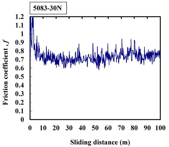 The average friction coefficient of 5083 is about 0.73 as shown in Figure 5. At the beginning of the friction process, the friction coefficient increases from 0.9 to 1.2. The friction coefficient swings at around 0.7 after the sliding distance of 5 m. Moreover, it shows a large amplitude and high friction frequency which indicate that the oxidation film has broken into small particles between the contact interfaces. As a result, the vibration amplitude of the machine is larger during the experimental process.