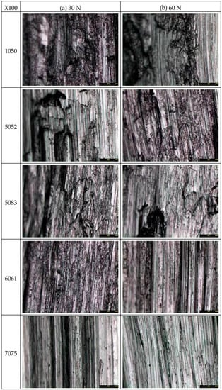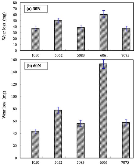 Three reproducibility experiments were conducted. The results of the average wear loss are shown in Figure 8. As shown in Figure 8a of 30 N, the average wear loss of 1050 aluminum alloy is 37 mg; 51 mg for 5052 aluminum alloy; 38 mg for 5083 aluminum alloy; 60 mg for 6061 aluminum alloy; and 38 mg for 7075 aluminum alloy. In Figure 8b of 60 N, the average wear loss of 1050 aluminum alloy is 44 mg, 78 mg for 5052 aluminum alloy; 57 mg for 5083 aluminum alloy; 153 mg for 6061 aluminum alloy; and 58 mg for 7075 aluminum alloy. Hence, the average wear losses are proportional to the normal loads. This indicates that the wear modes are regular. Moreover, the average wear loss of 6061 aluminum alloy is especially larger. Compared to the data in Table 1, the higher the contents of iron and copper, the more materials are removed, representing better machinability. Since the Fe/Fe and Cu/Fe pairs are compatible, this indicates that the wear losses for the compatible doping elements are larger [18]. On the other hand, it is worth noting that the wear loss of 5083 is quite small. This indicates that a higher content of Mn or Mg is harmless to the wear loss. Namely, if the pairs are incompatible, the wear losses are smaller [18]. As aluminum alloys are relatively soft and have a lower melting point, the wear particles produced in the friction process easily deviate from the contact interfaces, and the high temperature due to frictional heat results in material transfer. Therefore, optical microscopy of the wear track and SEM observation of the wear particle are both required for observing the wear mechanisms.