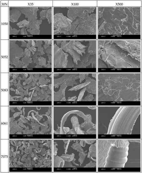 The 6061 and 7075 aluminum alloy materials produce strip-shaped wear particles. Several examples of ploughed particles are shown. In these two cases, ploughing is comparatively significant and large. It is believed that the ploughing wear particles are caused by grooving wear during the wear test [31].